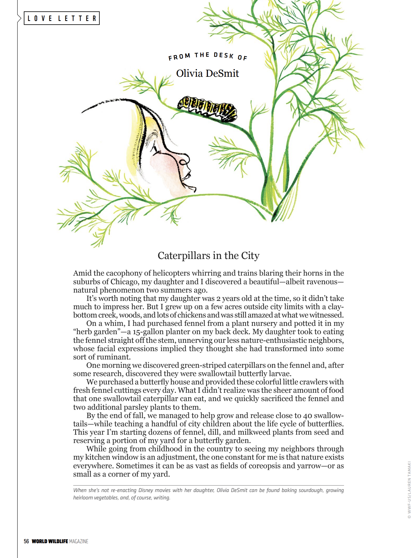 This essay for the World Wildlife Fund’s magazine explores my passion for nature and how I’m teaching the next generation the importance of creating habitats.